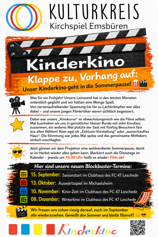 Auch im Herbst 2026 geht es weiter mit dem Kinderkino im Clubhaus des FC Leschede. Das Frühjahr ist vorbei. Nun stehen die Termine im Herbst jetzt fest.